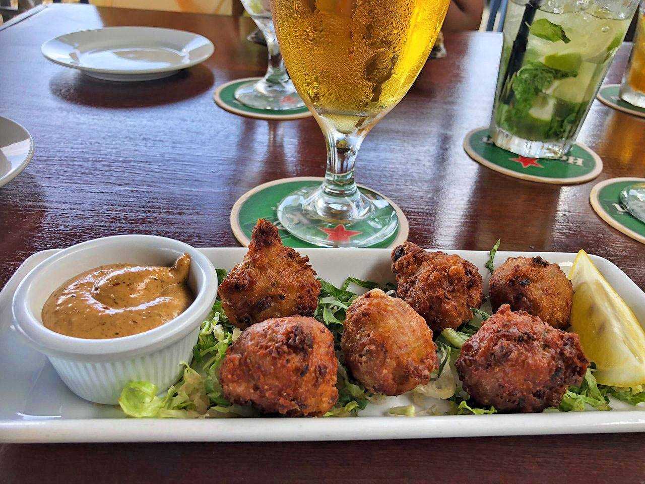 The fish tacos and the jerk chicken sandwich are equally delicious.